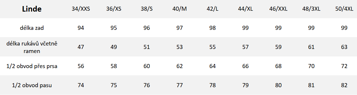 Bunda LINDEkomfortní střih a odpovídá běžným velikostem. Ve velikostech 48 a 50 je v oblasti břicha o něco užší.