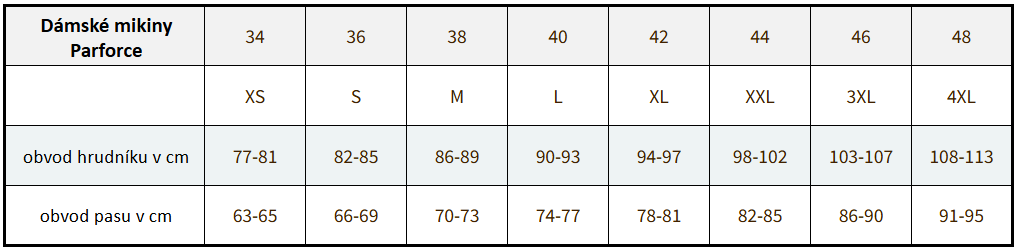 Velikostní tabulka: