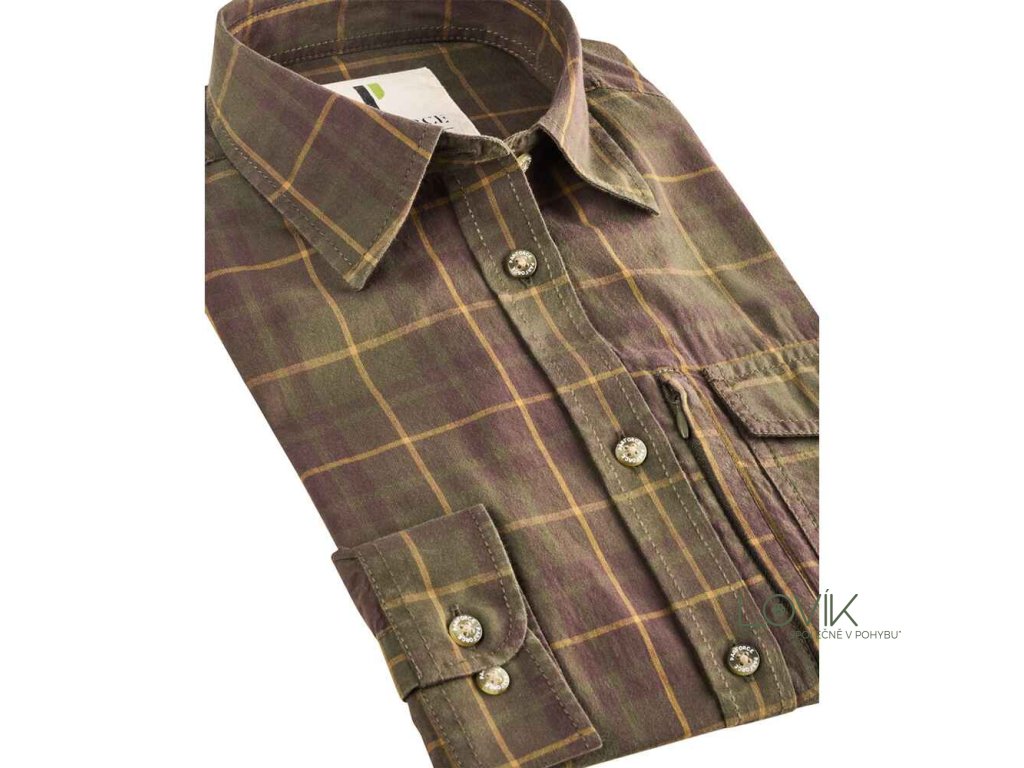 Blůza je vybavena náprsní kapsou s klopou a další svislou kapsou na zip, ideální například na lovecký lístek, poznámkový blok nebo drobné vybavení. Košilový límec podtrhuje klasický vzhled, zatímco logo na rukávu a výšivka loga na zádech dodávají decentní a stylový akcent.