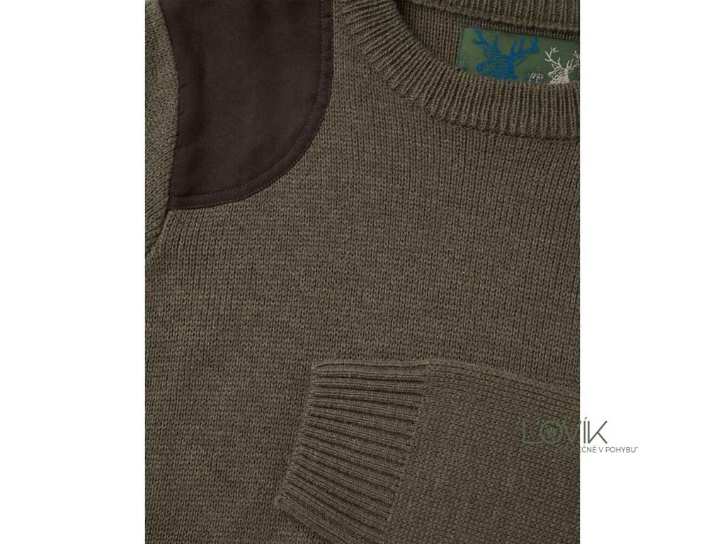 Svetr má klasický střih s kulatým výstřihem a žebrovanými lemy na rukávech, spodním okraji i kolem krku. Zvláštním detailem jsou ramenní výztuhy v imitaci semiše, které dodávají nejen elegantní vzhled, ale i větší odolnost v namáhaných místech.
