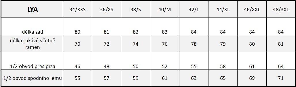 LYA má velmi elegantní delší střih, velikostně souhlasí s běžnou konfekcí. Zde najdete podrobný návod k správnému měření.