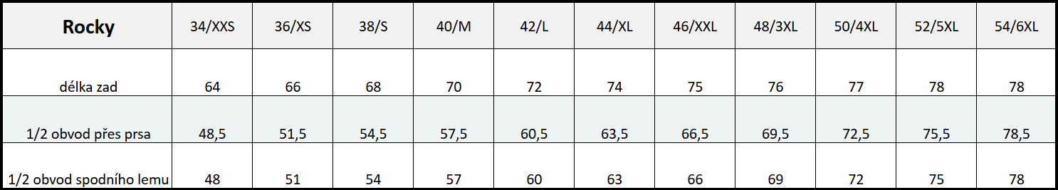 Rocky má pohodlný střih, velikostně vychází spíše větší, tzn. pokud standardně máte 40/M vychází vesta na 38/S, viz míry dole.
