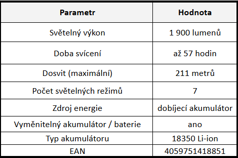 Uvedené hodnoty byly naměřeny podle standardu ANSI/PLATO FL1 v laboratorních podmínkách. Skutečné hodnoty se mohou lišit v závislosti na použitém akumulátoru, teplotě okolí a intenzitě použití. Tento standard zaručuje ověřený výkon, spolehlivost a kvalitu světla v terénu – ideální volba pro myslivost, outdoor a profesionální použití.