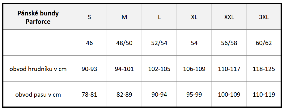 Velikostní tabulka: