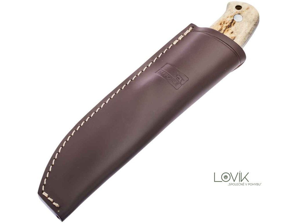 Rukojeť je vyrobena z pravého jeleního paroží, díky čemuž je každý kus originálem s jedinečnou strukturou a teplým přírodním charakterem. Materiál perfektně padne do ruky a zajišťuje jistý a pohodlný úchop. Nůž je navíc vybaven otvorem na pojistnou šňůru, což rozšiřuje jeho funkčnost v terénu.