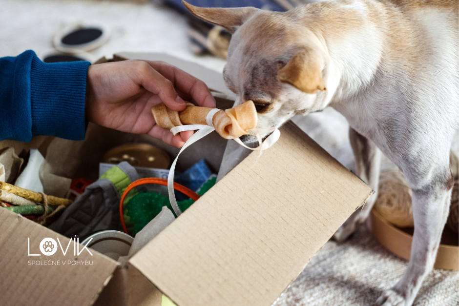 Krabice plná pokladů – kartonová krabice, papír a pár pamlsků. Pes hledá, čmuchá a přemýšlí.
