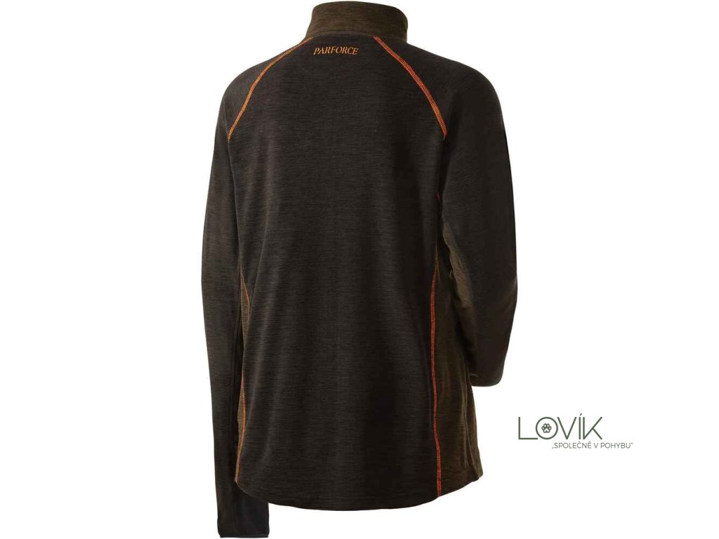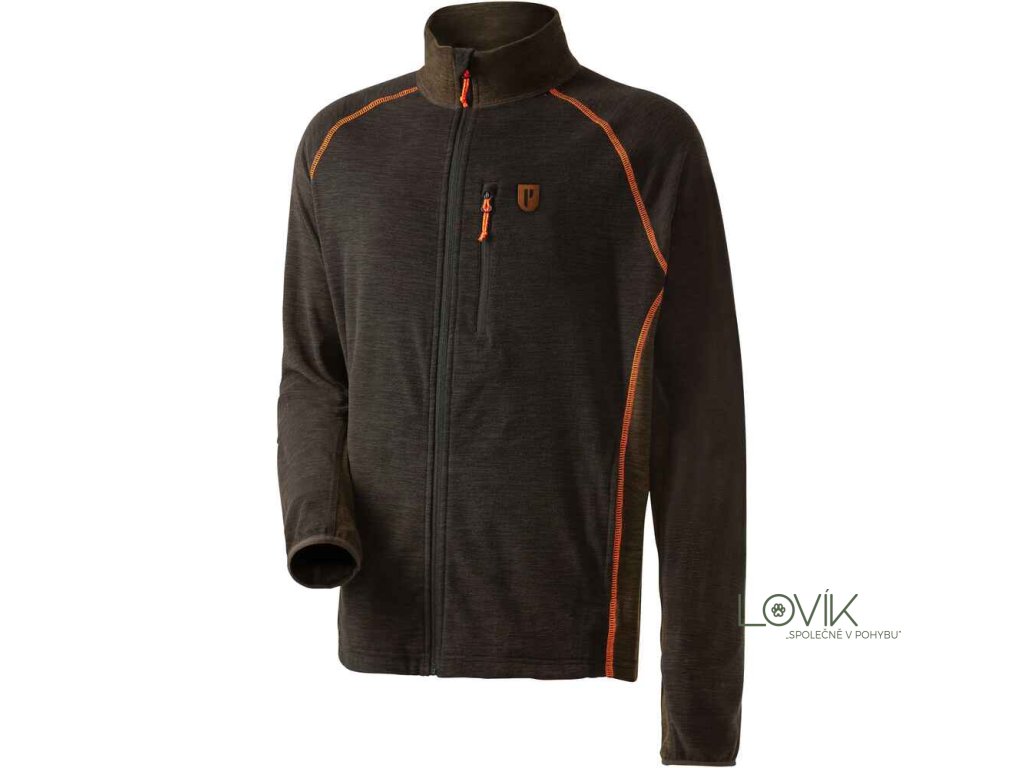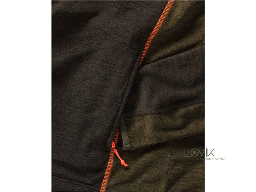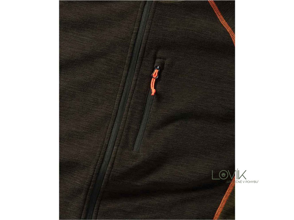 Fleece je jemně počesaný, velmi příjemný na dotek a lehký. Dvě boční kapsy a jedna náprsní kapsa na zip (všechny s oranžovým jezdcem) poskytují praktický úložný prostor pro drobnosti během lovu nebo výletu. Díky rovnému střihu s mírně prodlouženým zadním lemem a elastickým manžetám dobře sedí i pod vrchní loveckou bundou, aniž by překážela v pohybu.