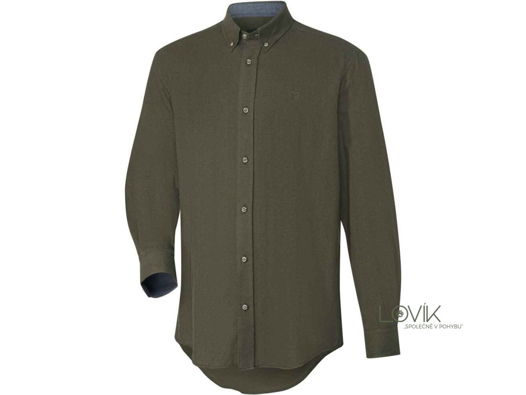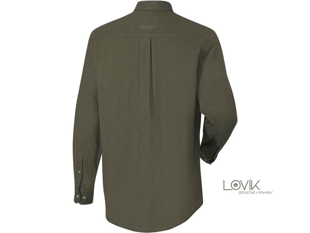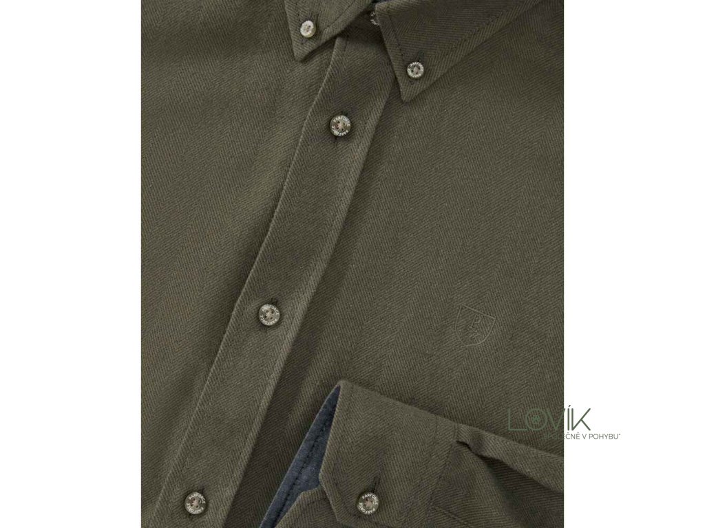 Košile je laděna do decentního olivového tónu s jemným vzorováním rybí kosti (fischgrat), což přispívá k přirozenému maskování v lese a nenápadnému pohybu v přírodě. Klasický límec na knoflíčky (button-down) udrží košili na místě i při náročnějším pohybu v terénu.