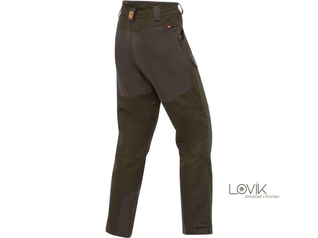 Pro náročné podmínky v lese i na posedu jsou kalhoty vybaveny odolnými, voděodolnými výztuhami v oblasti kolen, sedu a vnitřní části nohavic, které chrání před vlhkostí i opotřebením. Dvě klasické kapsy, doplněné o prostorné kapsy na stehnech a zadní kapsu se zipem, umožňují rychlý a bezpečný přístup k výbavě. Skryté háčky na šněrovací boty udrží nohavice pevně na místě i při delších túrách nebo náročnějším pohybu v terénu.